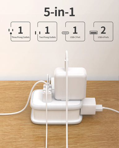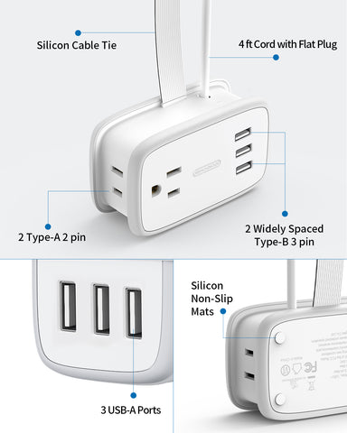 - [7 in ONE FOR NIGHTSTAND & TABLE DESK]: NTONPOWER pocket power strip is small and ergonomically designed with 2 Wide-spaced 3 Prong outlets, 2 Type A 2 Prong outlets, and 3 USB ports, expanding 1 to 7. The desktop power strip flat plug works great on your nightstand, home and office table desk to handle your Bluetooth speaker, laptops, smart phone, iPads, camera battery without probolems