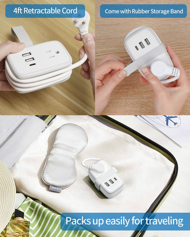 - TRAVEL-FRIENDLY DESIGN WITH WRAP-AROUND SHORT CORD: Carry-on Mini Pocket size With 4ft Wrap Around Cord. Lightweight 8 oz power strip won’t weigh down your travel bag; Flexible 4ft cord cleverly wraps around the body and plugs into a ac socket for neat storage