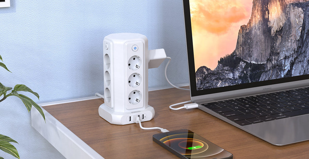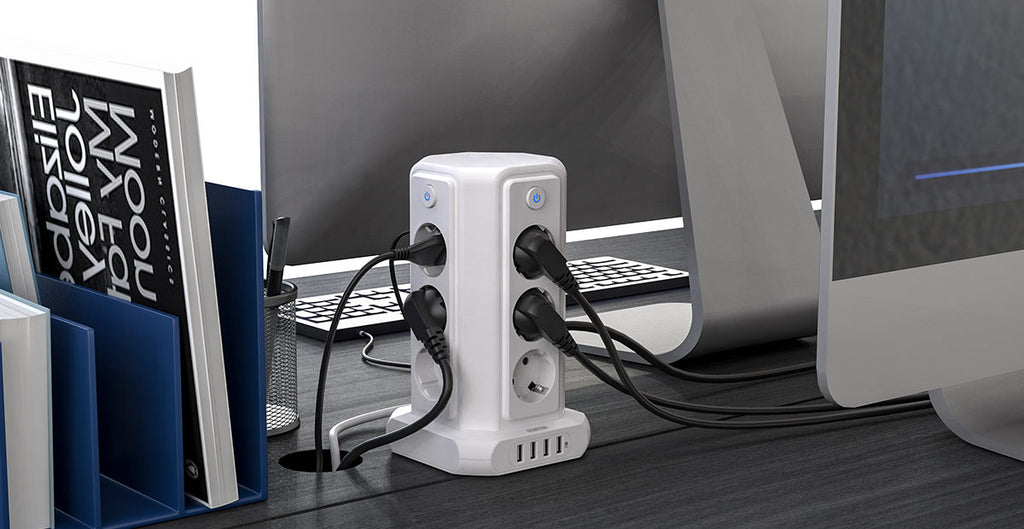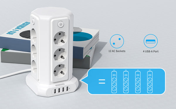 Four 3-way power strips are combined in a 12-way tower power strip, so you can save more space and organise the power cables. The four power strips are designed at different angles, so that large adapters do not interfere with each other when using. In addition, the power strip has 4 USB-A ports, so you can only charge small electronic devices with USB cables on the power strip. -